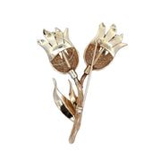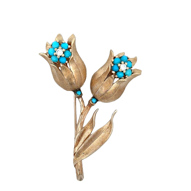 Vintage 14k yellow gold flower brooch decorated with turquoise cabochons and small diamonds. The leaves and stem of the flowers feature an elegant Florentine finish. Circa 1950-60s. The piece measures 1-1/2" wide x 2" tall. The two diamonds have a combined weight of 0.14 ct. with EF color and VS1-2 clarity. Appraised Value $2,500.00