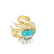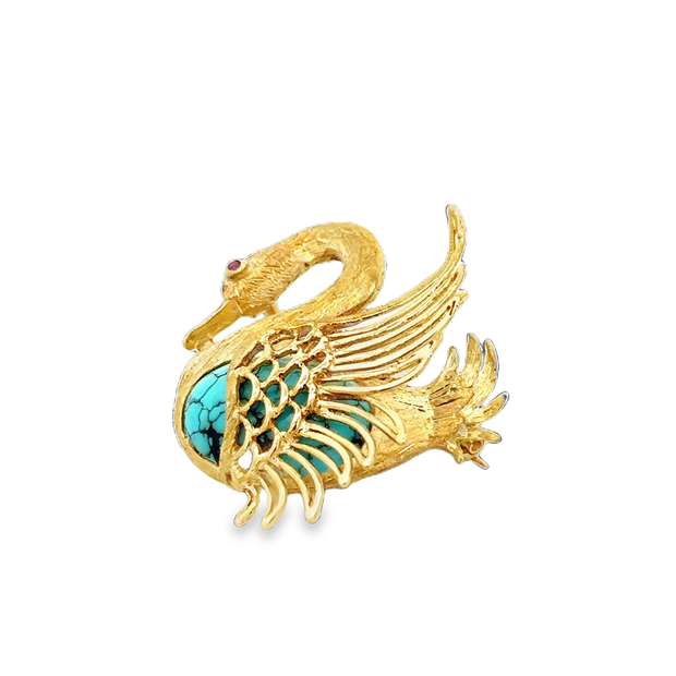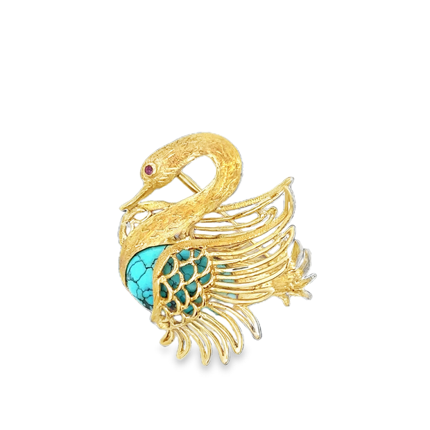 Vintage 18k yellow gold swan brooch accented with beautiful piece of turquoise on the body and accented with small rubies for eyes. The piece measures 1-1/4" wide x 1-1/2" tall. Appraised Value $3,000.00