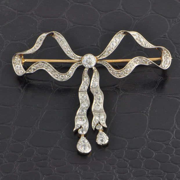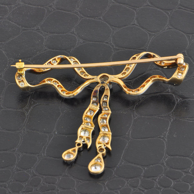 Antique Edwardian Diamond Bow Brooch in 18k Yellow Gold and Platinum