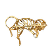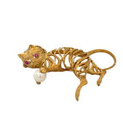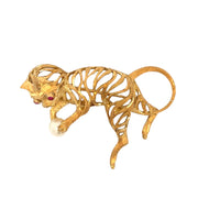 Vintage 18k yellow gold openwork cat brooch with ruby eyes and a 6.5 mm Akoya cultured pearl serving as the cat's ball of yarn. The unique piece features hand-textured detailing throughout. It measures 2" long and 1-1/2" tall and weighs 15.2 grams. Appraised Value $3,200.00