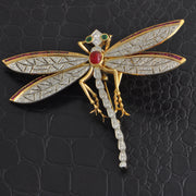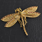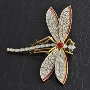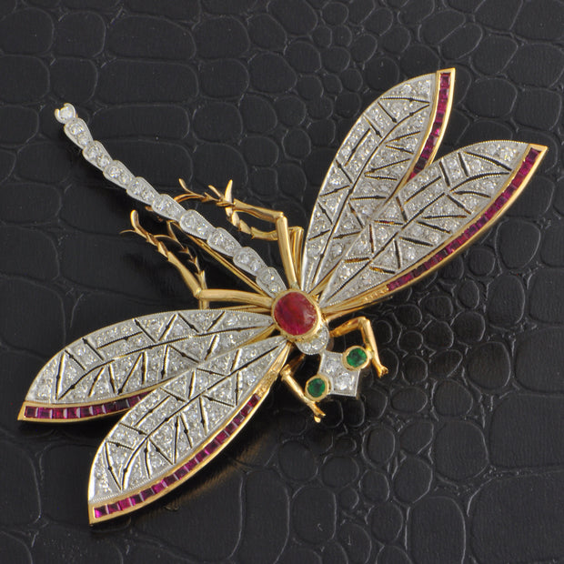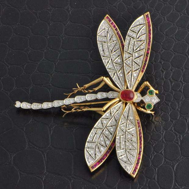 Vintage platinum topped dragonfly brooch accented with a glittering array of single cut diamonds in hand crafted, milgrain-edged settings. The edges of the dragonfly are decorated with calibre cut rubies, and the marvelous creature has two emeralds for eyes. One ruby cabochon centers the dragonfly's body, which is supported by masterfully spring loaded wings giving the piece elegant movement. A true work of art. The rubies and emeralds have a combined weight of 2.88 carats. The diamonds weigh 1.76 carat with GH color and VS2-SI2 clarity. The piece measures 2-3/4" wide 2-1/2" tall. Appraised Value $19,000.00