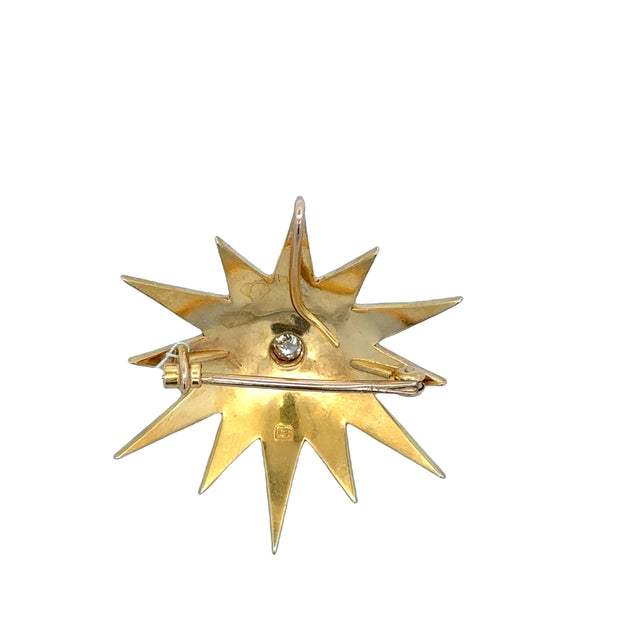 Antique Victorian 18k yellow gold starburst brooch/pendant accented with seed pearls and a single Old European cut diamond in the center. The diamond weighs 0.08 ct. with H color and I2 clarity. The piece measures 1-1/4" wide x 1-1/2" tall. Circa 1890s. Appraised Value $2,000.00