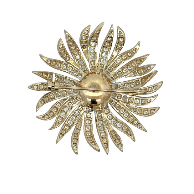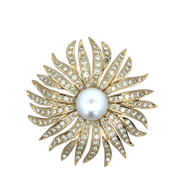 Vintage 18k yellow gold floral brooch centering an 11mm button pearl framed by an elaborate display of one hundred and fifty-five round brilliant cut diamonds. The diamonds have a total weight of 3.90 ct. with HK color and VS2-SI2 clarity. The piece measures 1-1/2" wide x 1-3/4" tall. Circa 1970s. Appraised Value $6,900.00