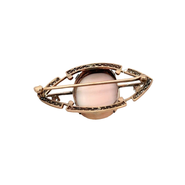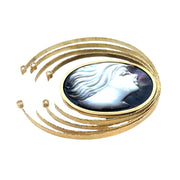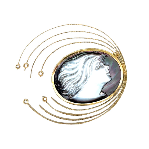 Vintage 18k yellow gold Italian brooch showcasing a Mother of Pearl cameo in an oval shape frame with flexible gold wire accents set with small round brilliant cut diamonds. The piece measures 2-1/4" w x 2" tall. Appraised Value $1,790.00