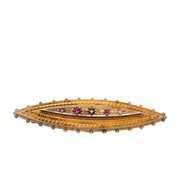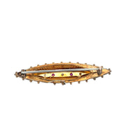 Antique Victorian 15k rose gold navette shaped brooch featuring an alternating pattern of star-set rubies and rose cut diamonds with beaded accents throughout the piece. It measures 1-7/8" wide x 1/2" tall. Circa 1900-1910s. Appraised Value $1,800.00