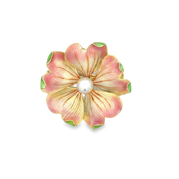 Antique Art Nouveau 14k yellow gold flower brooch decorated with pink and green enamel. There is a cultured Akoya pearl in the center of the design. The brooch measures 7/8" x 7/8". Circa 1910s. Appraised Value $3,090.00