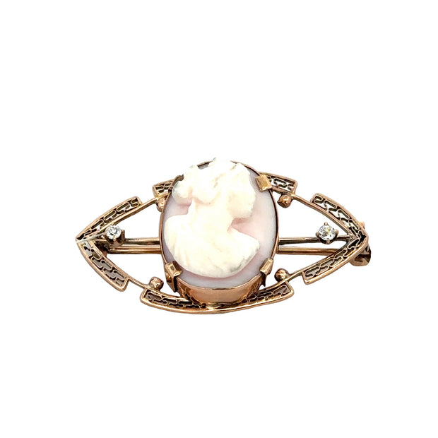 Antique Art Nouveau filigree navette shaped brooch featuing a shell cameo depicting the silhouette of a woman. The brooch is accented with two small diamonds on each side of the cameo. The diamonds have a total weight of 0.10 ct. with HI color and I1-2 clarity. The brooch measures 1-1/2" wide x 3/4" tall. Circa 1900s-1910s. Appraised Value $450.00