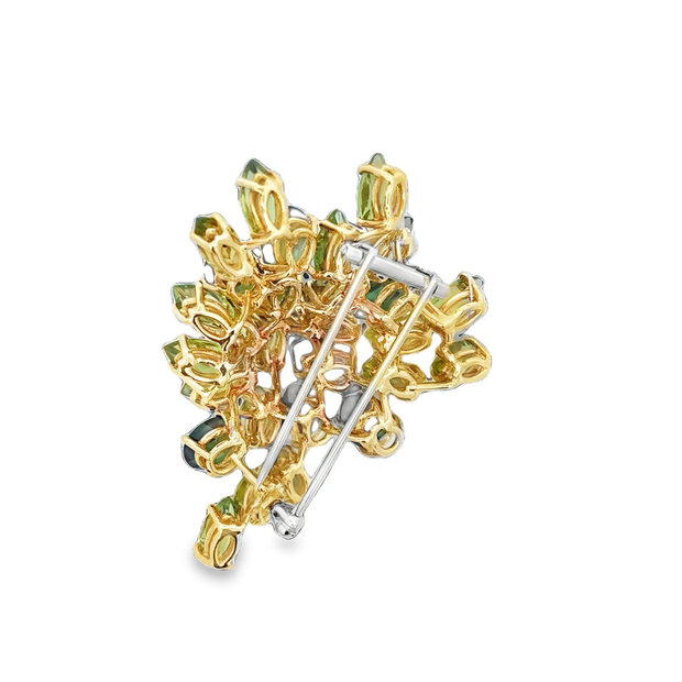 Beautiful 18k yellow gold foliate style brooch featuring an array of marquise and pear cut green tourmalines and peridot. The piece also contains six round brilliant cut diamonds totaling 0.48 ct. with G color and VS2 clarity. The gemstones have a total weight of 13.22 carats. The piece measures 2" tall x 1-3/4" wide. Appraised Value $8,000.00