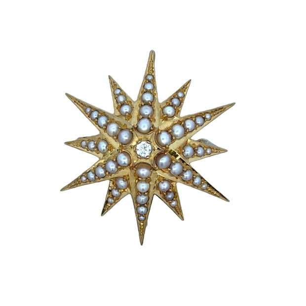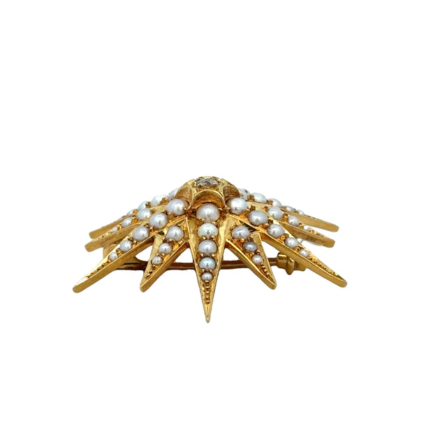 Antique Victorian Seed Pearl and Diamond Starburst Brooch / Pendant in 18k Yellow Gold