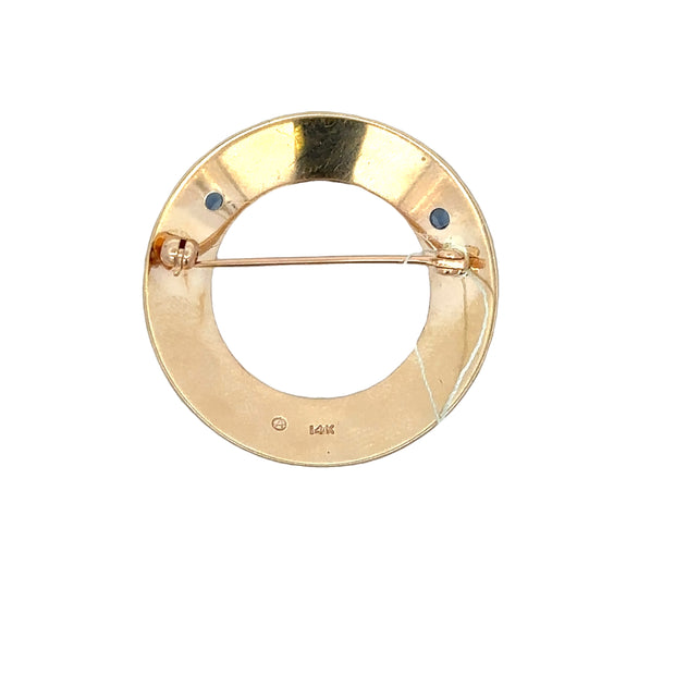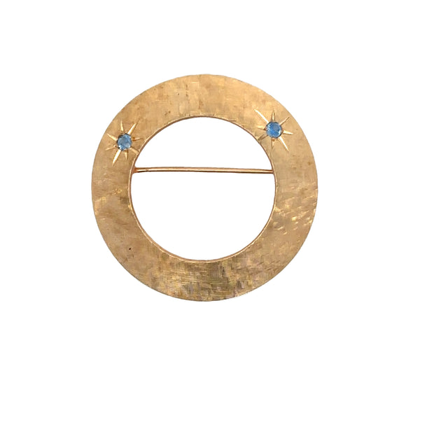 Vintage 14k yellow gold circle brooch accented with blue sapphires in star recessed settings. The sapphires have a total weight of 0.10 ct. The piece has a rich Florentine finish and measures 1-1/4" x 1-1/4". Circa 1980s. Appraised Value $790.00