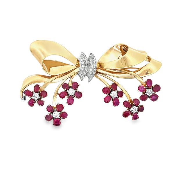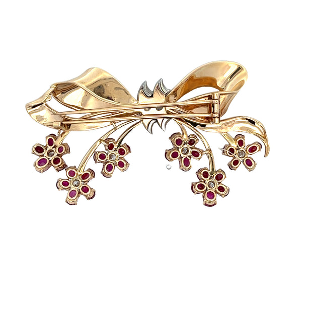 Vintage statement Retro 14k rose and white gold bow brooch decorated with floral designs made up of vibrant rubies and Old European cut diamonds. The rubies have a total weight of 9.0 carats while the diamonds weigh 2.59 carats with HJ color and Circa 1940s. The piece measures 3" x 2'. Appraised Value $11,500.00