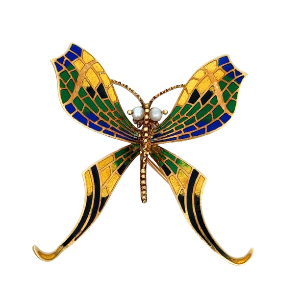 18k yellow gold enameled butterfly pin with paneled sections of green, yellow, black, and green. The piece measures 1-7/8" x 2". The butterfly has seed pearls for eyes. Each pearl measures approx. 3 mm. Circa 1960-70s. Appraised Value $2,690.00