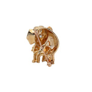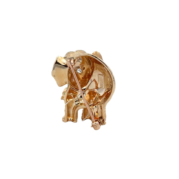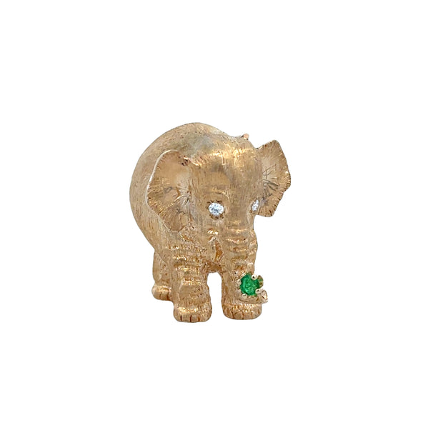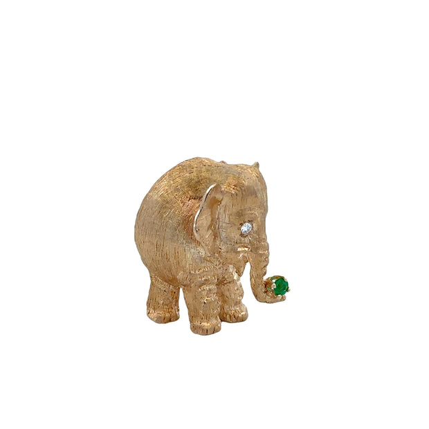 This charming vintage 14K yellow gold elephant brooch, circa 1960s, showcases a beautifully detailed brushed finish, giving it a rich texture and character. Featuring diamond eyes for a touch of brilliance and a vibrant emerald accent on the trunk, this exquisite piece embodies both elegance and whimsy. Measuring 7/8" tall x 7/8" wide, this collectible brooch is a timeless symbol of strength and good fortune. Appraised Value $2,690.00
