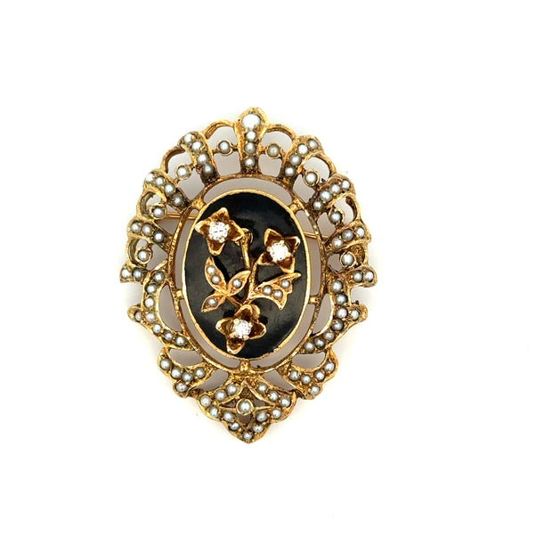 Vintage Onyx, Seed Pearl and Diamond Brooch in Yellow Gold