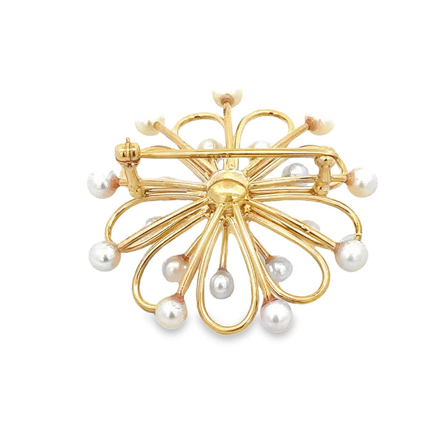 Vintage 14k yellow gold brooch with an openwork design accented with beautiful Akoya cultured pearls ranging in size from 4 - 6.5 mm. The brooch measures 1-3/8" x 1-1/4". Circa 1980s. Appraised Value $895.00
