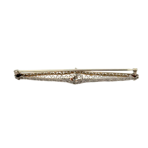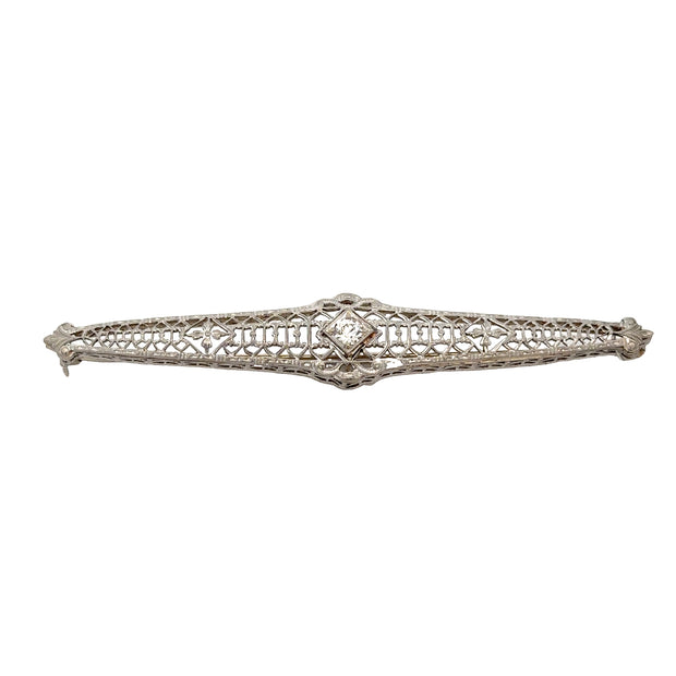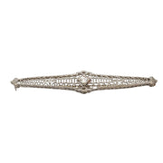 Beautiful vintage Art Deco bar pin with hand crafted filigree work centering a 0.20 ct. Old European cut diamond with H color and VS2 clarity. The piece measures 2-5/8" long. Rhodium plated. Appraised Value $790.00