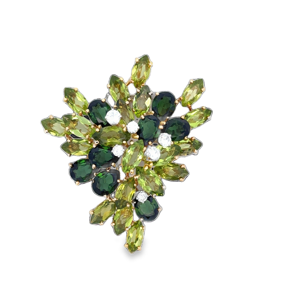 Vintage Peridot, Green Tourmaline, and Diamond Brooch in Yellow Gold