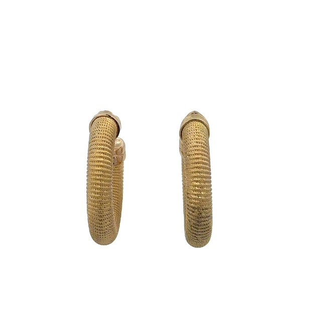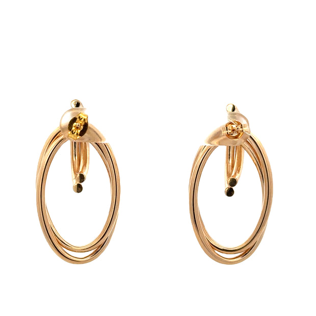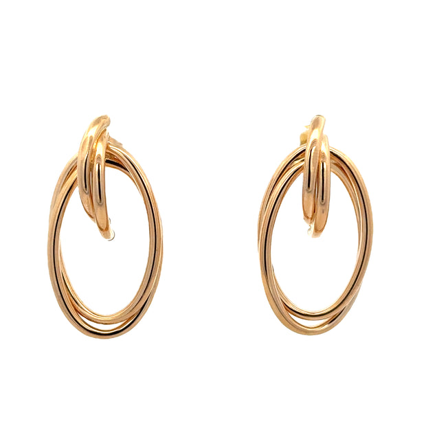 These elegant 14K yellow gold oval earrings feature a sophisticated interlocking design, creating a timeless and versatile look. Measuring 1-1/2" tall x 3/4" wide, their sleek silhouette makes them perfect for both everyday wear and special occasions. Crafted with exceptional craftsmanship, these earrings are a classic addition to any fine jewelry collection. Appraised Value $1,000.00