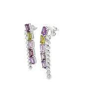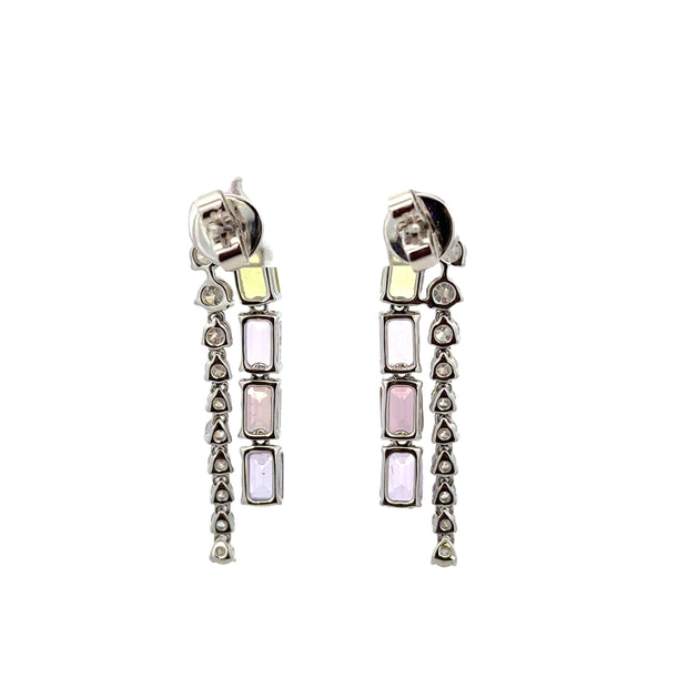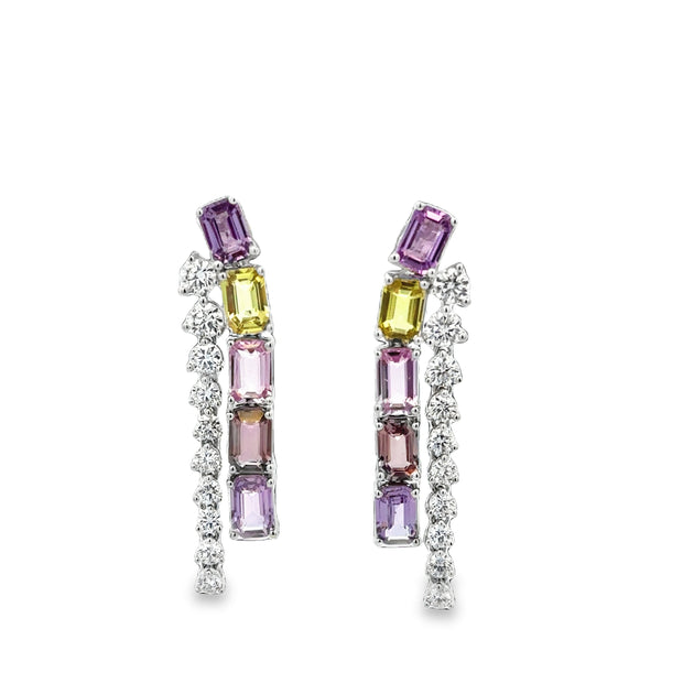 These 18K white gold earrings showcase a breathtaking array of rare multi-colored sapphires, including deep purple, chartreuse, pink, mauve, and violet, totaling 5.88 carats. Elegantly balanced, the sapphires are complemented by cascading round brilliant-cut diamonds on the opposite side, adding 1.38 carats of sparkle in I color and VS2-SI2 clarity. Measuring 1-3/8" tall, these exquisite earrings blend vibrant color with timeless elegance. Appraised at $18,000, they make a luxurious statement piece for any fine jewelry collection.