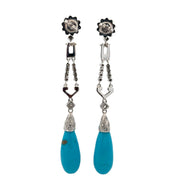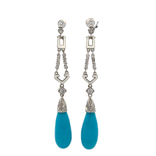 18k white gold earrings dangle earrings with dangling tear drop shaped Persian turquoise capped with diamond settings framed by geometric plaques with with white enamel. The diamonds have a combined weight of 0.70 ct. with GH color and SI1-2 clarity. The earrings measure 3" tall. Appraised Value $5,290.00