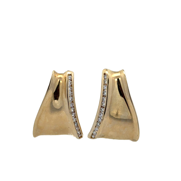 These modern 14K yellow gold huggie-style earrings feature a sleek and elegant design, with round brilliant-cut diamonds lining one side for a sophisticated touch of sparkle. The diamonds have a combined weight of 0.39 ct., showcasing GH color and VS2-SI1 clarity for exceptional brilliance. Measuring 1" tall x 5/8" wide, these versatile earrings offer timeless elegance for any occasion. Appraised Value $2,400.00