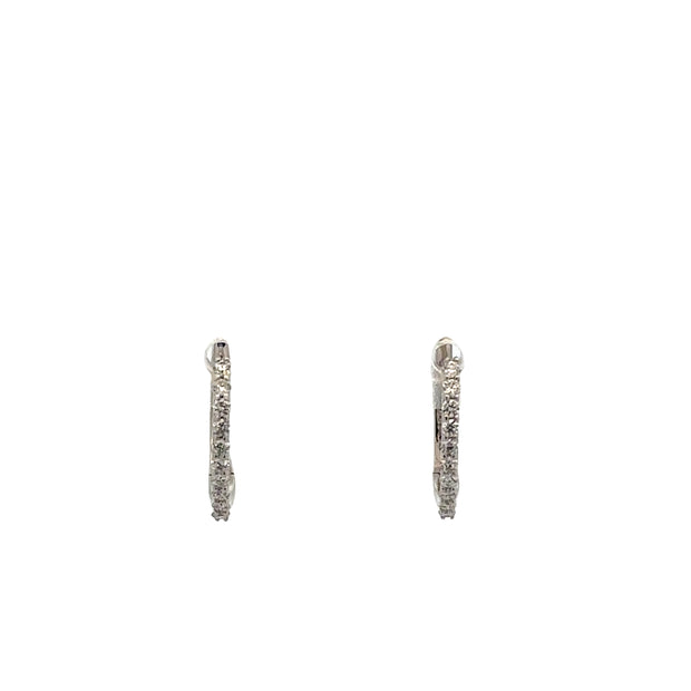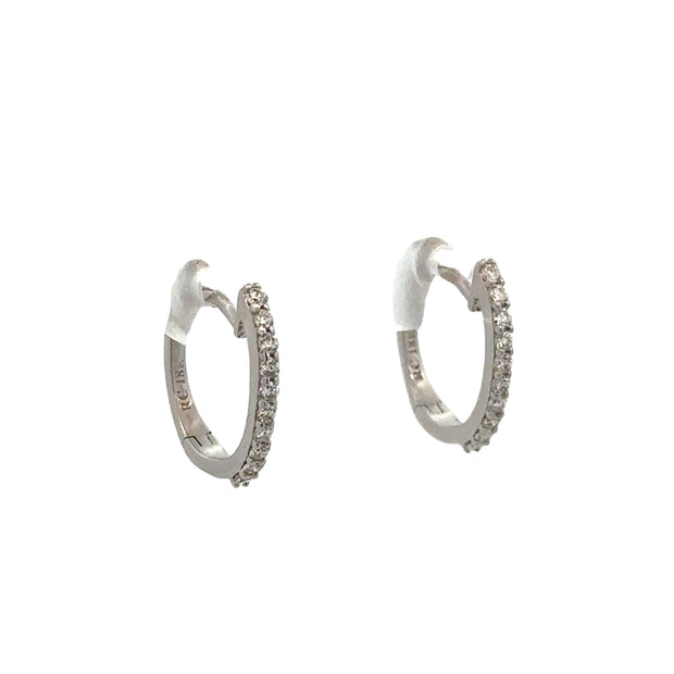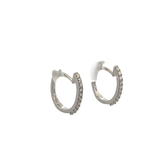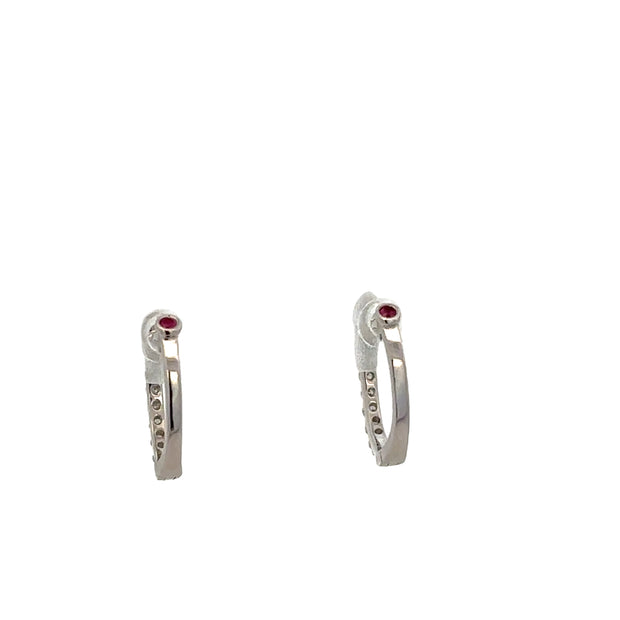 18k white gold hoop earrings by Roberto coin featuring twenty round brilliant cut diamonds and small signature rubies on the backs of each earring. The diamonds have a combined weight of 0.22 ct. The earrings measure approx. 1/2" tall. Rhodium plated. Appraised Value $1,150.00