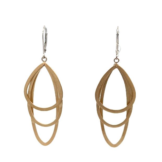 These elegant brushed 14K yellow and white gold triple hoop earrings feature a sophisticated design with graceful movement, creating a dynamic and eye-catching effect. Measuring 2-1/2" long, their sleek combination of metals adds versatility and timeless charm. A perfect statement piece for any jewelry collection. Appraised Value $1,600.00