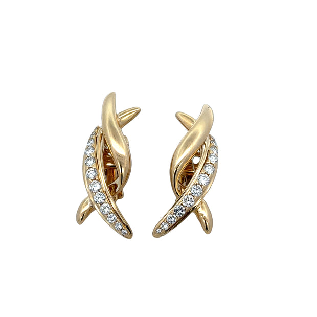 These exquisite 18K yellow gold clip-on earrings by Tiffany & Co. feature a sophisticated ribbon-like "X" bypass design, embodying timeless elegance and luxury. Adorned with round brilliant-cut diamonds, totaling 1.20 carats, these stunning stones showcase GH color and VS1-SI1 clarity, adding exceptional brilliance to the design. A true statement of craftsmanship and refinement, these earrings are a must-have for any fine jewelry collection. The earrings measure 1-3/8" tall. Appraised Value $5,590.00