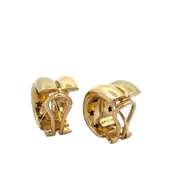 These stunning wide 18K yellow gold huggie earrings by designer H. Stern showcase a unique double-sided design, featuring one smooth side and one hammered side for versatile styling. Adding an artistic touch, the backs of the earrings are adorned with star cutouts, reflecting the brand’s signature celestial inspiration. Measuring 3/4" tall and crafted with expert precision, these circa 2000s earrings are a timeless blend of modern elegance and distinctive craftsmanship. Appraised Value $3,290.00