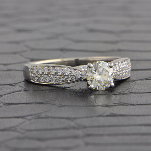 14k white gold engagement ring centering a 0.70 ct. round brilliant cut diamond with K color and SI1 clarity. The shoulders of the ring are elegantly tapered and accented with two rows of round brilliant cut diamonds for a total of 0.32 ct. with HI color and VS2-SI2 clarity. The ring is a size 8 and can be sized. Rhodium plated. Appraised Value $3,500.00
