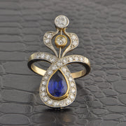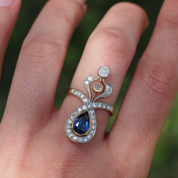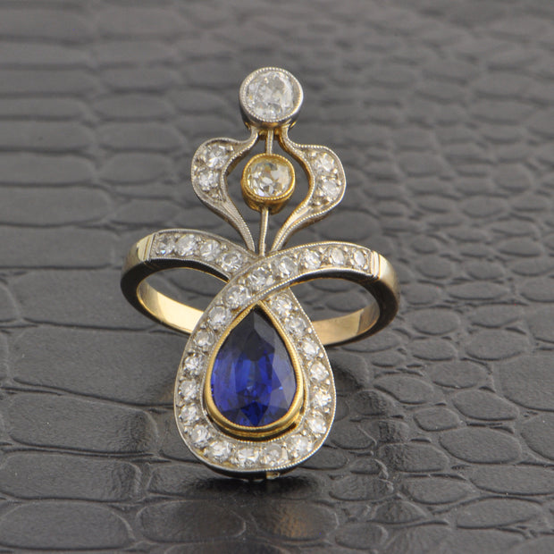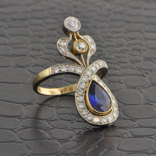 Antique Edwardian platinum topped 18k yellow gold ring showcasing a beautiful 1.58 ct. pear cut blue sapphire framed by an array of stunning antique diamonds including Old Mine, Old European, and single cuts. The diamonds in the piece have a total weight of 1.50 carat with HL color and VS2-I1 clarity. The ring is a size 7 and can be sized. Circa 1910s. Appraised Value $8,190.00