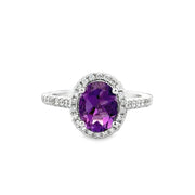 14k white gold ring centering a 2.0 ct. amethyst framed by a halo of diamonds. The diamonds have a total weight of 0.44 ct. with GH color and SI2-I2 clarity. The ring is a size 7 and can be sized. Rhodium plated. Appraised Value $2,190.00
