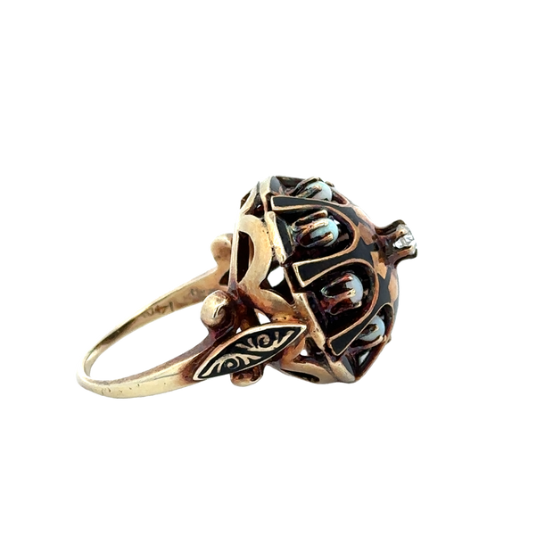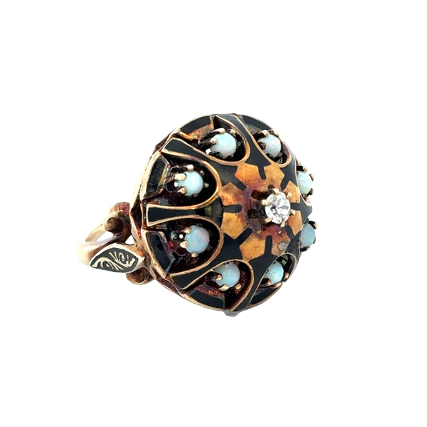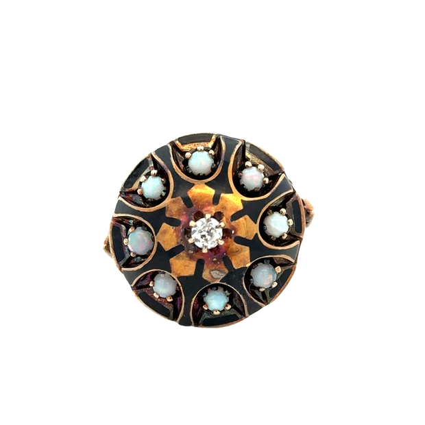 Antique Victorian 14k yellow gold domed statement ring centering a 0.10 ct. Old European cut diamond in an ornate setting decorated with black enamel and a circle of eight round opals framing the diamond. The ring is a size 7.5 and can be sized. Circa 1880-90s. Appraised Value $2,490.00