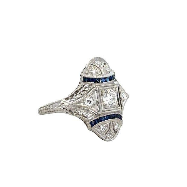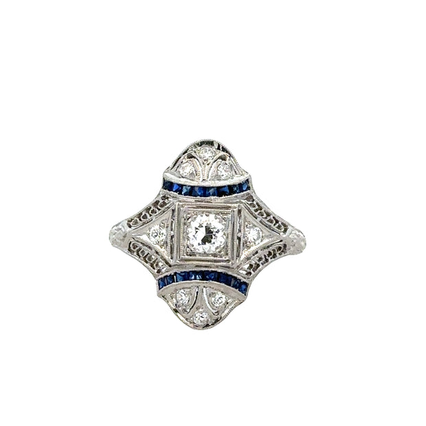 Antique platinum Art Deco cocktail ring centering an Old European cut diamond in a box shape setting accented with additional diamonds and curved rows of calibre cut sapphires in a shield shaped frame. The diamonds in the piece have a total weight of 0.46 ct. with FG color and VS1 clarity while the sapphires weigh 0.15 ct. The ring is a size 6.25 aand can be sized. Circa 1920s. Appraised Value $1,490.00