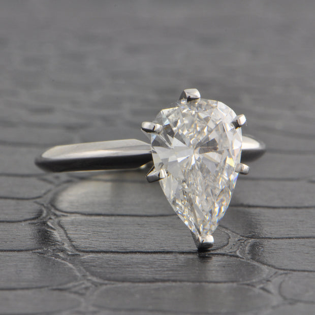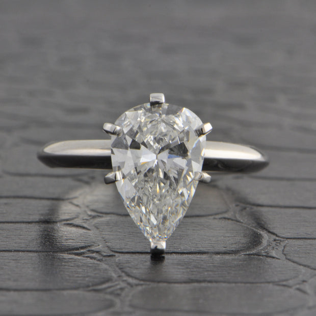 14k white gold engagement ring centering a 2.11 carat pear shape diamond with E color and VS2 clarity. The diamond is accompanied by GIA grading report #5222428863. Rhodium plated. Appraised Value $35,000.00
