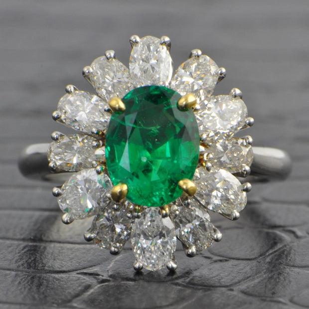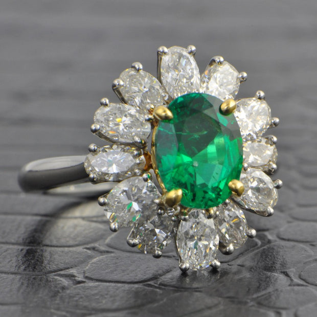 Albert Pujol platinum and 18k yellow gold ring centers on one 1.42 carat emerald surrounded by a halo of twelve diamonds weighing approx. 1.98 carat total weight with H color and VS2-SI1 clarity. Appraised Value $15,090.00