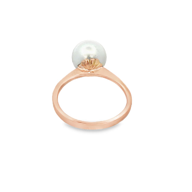 14k rose gold ring showcasing a 9.2mm Akoya cultured pearl sitting prominently atop the finger. The ring is a size 7 and can be sized. Appraised Value $690.00