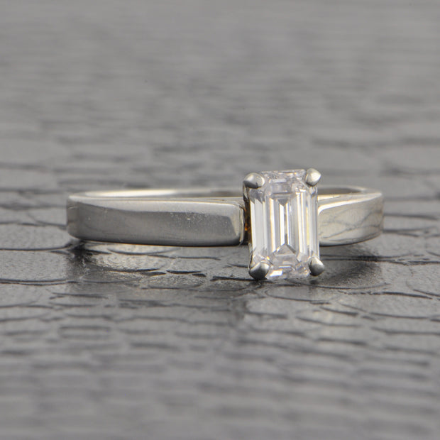 Platinum engagement ring centering a 0.74 ct. emerald cut diamond with E color and VS1 clarity. The diamond is accompanied by a GIA grading report. The ring is a size 7.5 and can be sized. Appraised Value $5,500.00