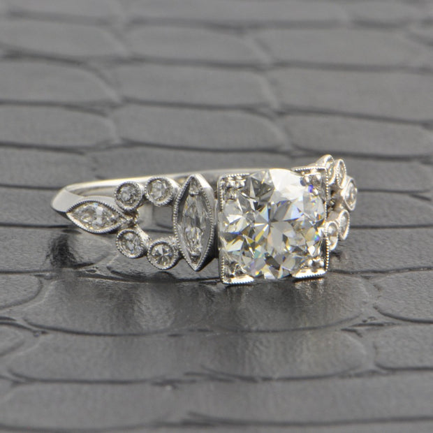 Platinum engagement ring centers one Old European cut diamond weighing 1.48 carat with bright G color and VVS1 clarity. The center stone is accented with an open work design made up of twelve marquise and single cut diamonds in bezel settings, 0.40 carat total wieght with HI color and VS clarity. The ring is a size 6.25 and can be sized. Appraised Value $30,000.00