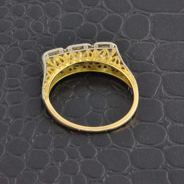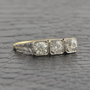 Antique platinum and 14k yellow gold ring featuring three Old European cut diamonds in box style settings with milgrain edging. The diamonds have a total weight of 0.90 ct. with HI color and SI1-2 clarity. The gallery of the ring features delicate piercework and scrolled details.The ring is a size 6.5 and can be sized. Circa 1910s. Appraised Value $6,190.00