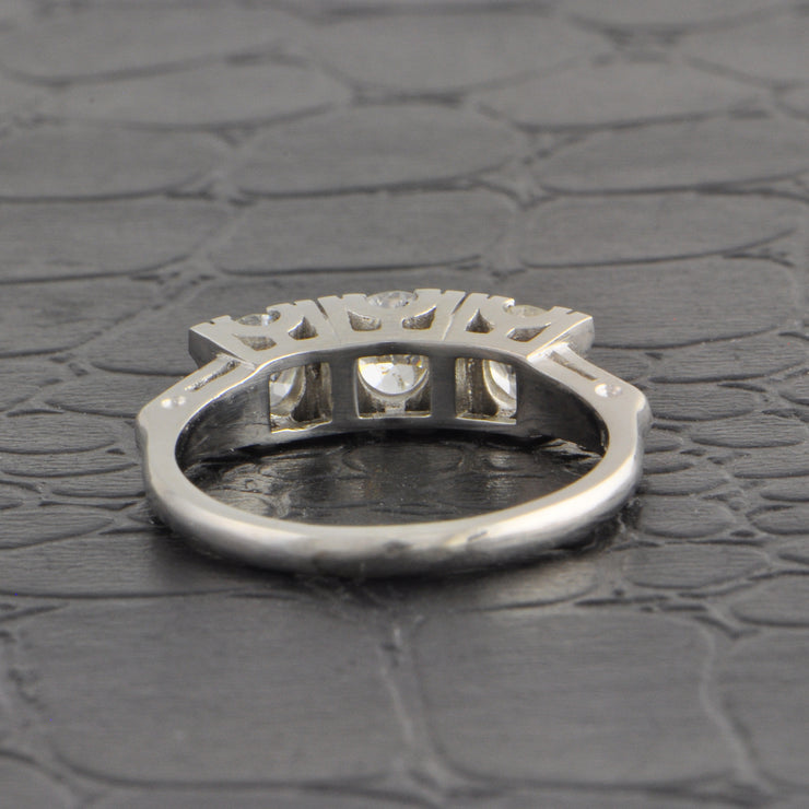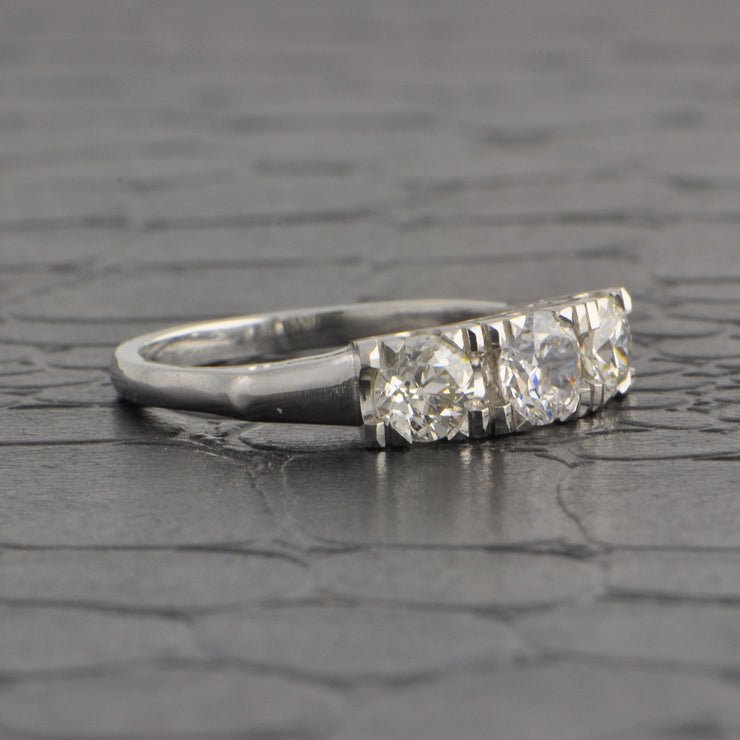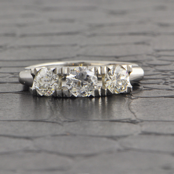 Vintage platinum ring showcasing three prong set transitional/round brilliant cut diamonds in a raised, angular setting. The diamonds have a total weight of 1.03 carat with JL color and VS2-I1 clarity. The ring is a size 5.75 and can be sized. Circa 1950s. Appraised Value $4,590.00