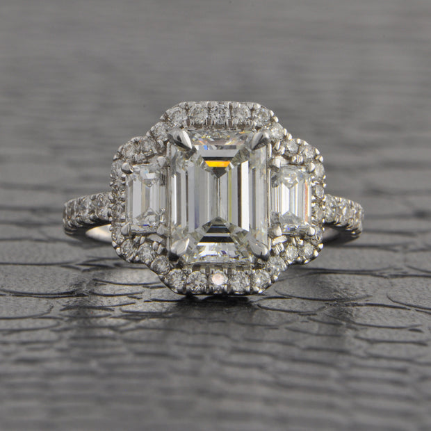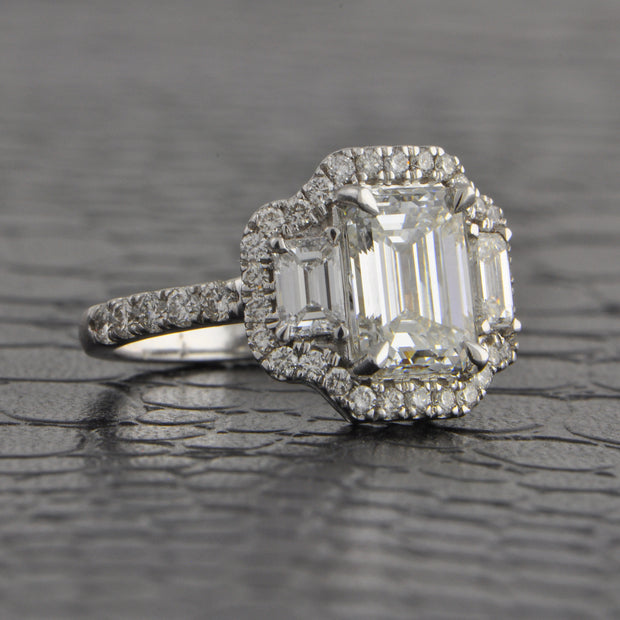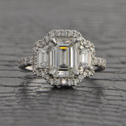 Magnificent Three Stone Emerald Cut Halo Engagement Ring in White Gold